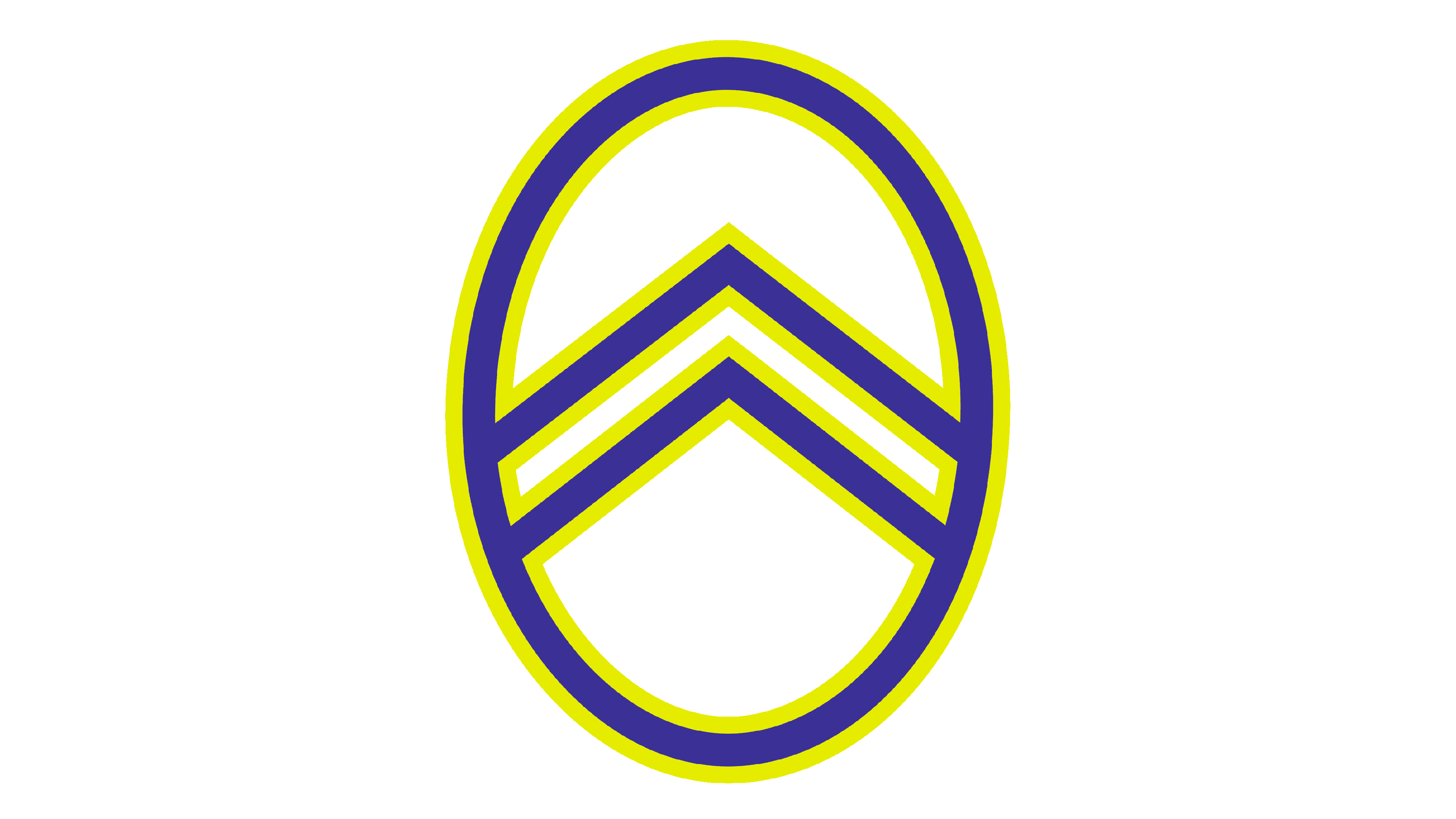 In 1959 the French automaking company introduced a new logo, with two sharp chevrons drawn in a three-dimensional way, with two shades of yellow, and a thin, barely visible gray contour of the horizontally oriented oval. The contour was overlapped by the massive chevrons both on top and bottom.